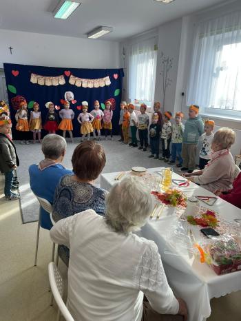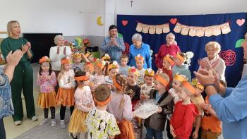 Dzieci z grupy Tropicieli zaprezentowały krótki występ artystyczny, a następnie wraz z naszymi gośćmi stworzyli jesienną orkiestrę. Przedszkolaki wręczyły również prezenty, przyniesione w ramach akcji: "Dla seniora coś pysznego, coś słodkiego, coś ciepłego" organizowanej w naszym przedszkolu, za co serdecznie dziękujemy.