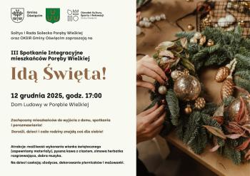 Sołtys i Rada Sołecka Poręby Wielkiej oraz Ośrodek Kultury, Sportu i Rekreacji Gminy Oświęcim serdecznie zapraszają na III Spotkanie Integracyjne, które odbędzie się 12 grudnia 2025 r. o godz. 17:00 w Domu Ludowym w Porębie Wielkiej.