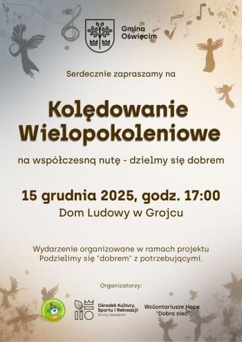 Serdecznie zapraszamy wszystkich – dzieci, młodzież, dorosłych i seniorów na wyjątkowe Kolędowanie Wielopokoleniowe, które odbędzie się 15 grudnia 2025 r. o godz. 17:00 w Domu Ludowym w Grojcu.